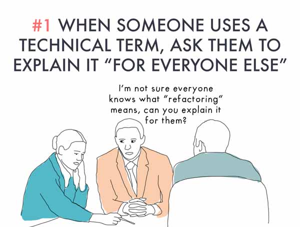 If a technical term is used, stop the person and say, “I think some folks here might not know what that is, could you explain it for them?” or “I think we might have different interpretations of that word, can you describe how you’re using it?” This way you look like you’re trying to get everyone up to speed, and you can finally figure out what that technical term means.