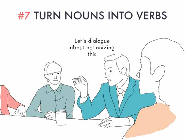 If you’re ever struggling for something to say, just take a noun and verbalize it. Using simple words in new and interesting ways will creativize your presence.
