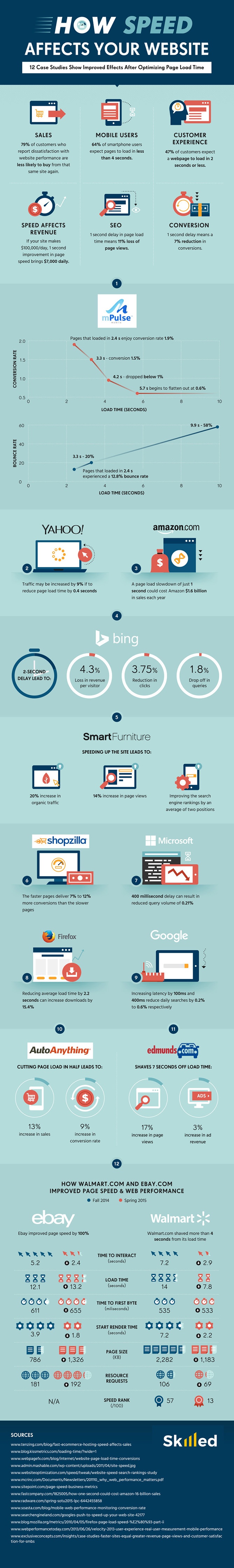 To see the real power of page load time, a company called Skilled compiled 12 case studies from real companies in the infographic below. These examples illustrate the impact reducing page load time.