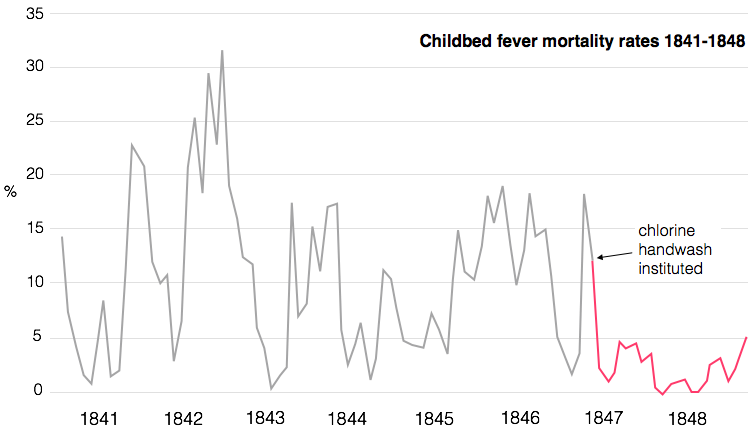 In the first three months, death rates plummeted from one in ten to one in a hundred. Semmelweis had shown that he could conquer childbed fever with handwashing.