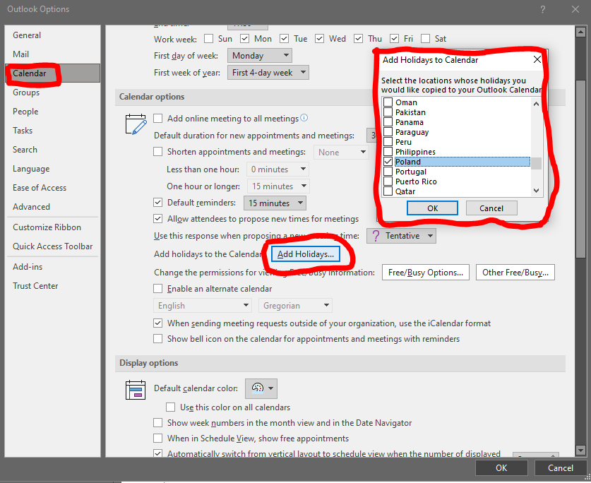 Within Outlook you can add holidays for the UK as well as other countries which can help give you visibility of holidays, festivals or religious events from around the world. This can help drive conversation about things that might matter to people in your team you otherwise might not know about. For example I recently learned about Fat Thursday or Tłusty Czwartek celebrated in Poland ahead of Lent. You can add them in Outlook by going File > Options > Calendar > Add Holidays…